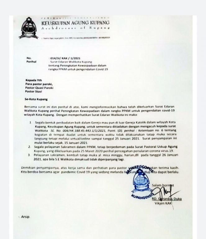 Dalam surat edaran yang ditanda tangani Vikaris Jenderal Keuskupan Agung Kupang, RD, Geradus Duka, Pr nomor 014/SI/KAK/1/2021 ditujukan kepada Pastor Paroki, Pastor Quasi Paroki dan Pastor Stasi. Isinya adalah segala bentuk peribadatan baik dalam gereja maupun diluar gereja dalam Kota Kupang dalam wilayah Keuskupan Agung Kupang ditiadakan.