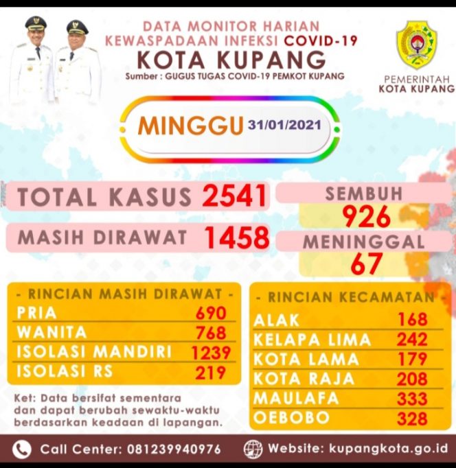 ” Update data monitor pada hari Minggu, 31 Januari 2021, disampaikan kepada Masyarakat Kota Kupang, bahwa total Kasus sebanyak 2.451 Orang (Naik sebanyak 32 Orang,” jelasnya.