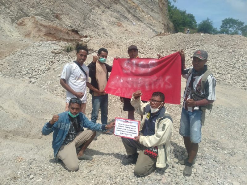 Dilokasi aktivitas tambang itu, mereka membentangkan spanduk yang bertuliskan “STOP AKTIFITAS DI TANAH INI” dan Pamflet yang bertuliskan “STOP !!! HENTIKAN AKTIFITAS DIATAS TANAH ADAT LEWOLERA/LAMADALE DIBAWAH PENGAWASAN SUKU OLEPUE.