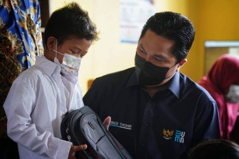 Dorongan semangat tersebut diungkapkan Menteri BUMN, Erick Thohir saat menyaksikan penyerahan bantuan dari BRI kepada SD Negeri Cikuya III, Cikuya, Kecamatan Solear, Kabupaten Tangerang, Banten, Minggu (12/9). BRI sebagai salah satu BUMN, terus menunjukkan komitmennya untuk memajukan pendidikan di Indonesia. Melalui program CSR BRI Peduli, BRI menyalurkan bantuan berupa 1.000 pasang seragam sekolah untuk 10 sekolah dasar. Selain itu, untuk meningkatkan budaya gemar membaca bagi siswa juga diberikan bantuan rak buku, buku bacaan, dan peralatan menggambar/mewarnai untuk 15 taman bacaan masyarakat. Tidak hanya itu, BRI juga memberikan bantuan berupa pembangunan jembatan penyeberangan sungai untuk memudahkan akses para murid ke sekolah. Dalam kesempatan tersebut, didampingi Kepala Sekolah SD Cikuya III, Supriyatmo, Menteri BUMN juga menggelar berdialog dengan para guru.