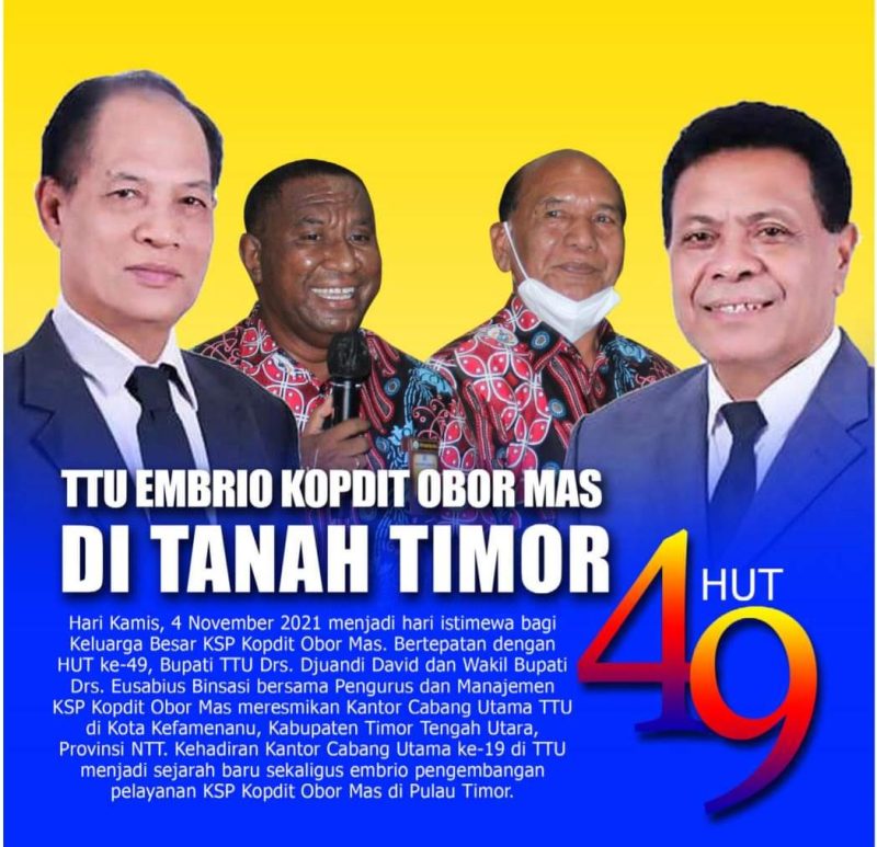 Kehadiran Kantor Cabang Utama ke-19 di TTU adalah sejarah baru sekaligus menjadi embrio pengembangan pelayanan KSP Kopdit Obor Mas pada 6 Kabupaten/Kota di Pulau Timor.