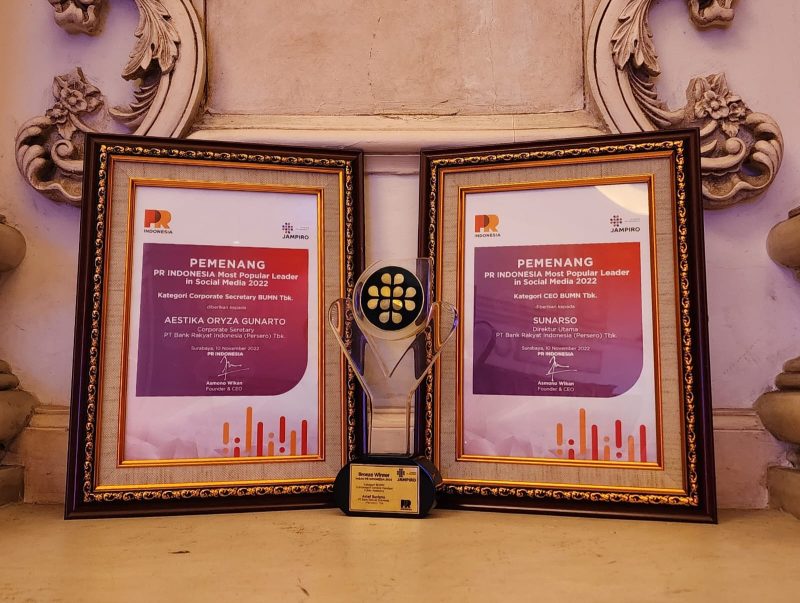 BRI memborong tiga kategori penghargaan sekaligus, antara lain Direktur Utama BRI Sunarso sebagai Pemimpin Terpopuler di Media Sosial 2022 Kategori Pemimpin /CEO BUMN Tbk, Corporate Secretary BRI Aestika Oryza Gunarto sebagai Pemimpin Terpopuler di Media Sosial 2022 Kategori Corporate Secretary BUMN Tbk, dan Senior Manager Corporate Communication BRI sebagai Insan PR Terbaik Kategori General Manager Corporate Communication BUMN.