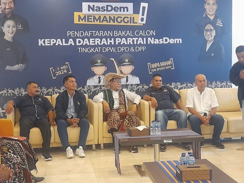 Yusak Meok melakukan pendaftaran di Kantor DPW NasDem NTT didampingi sejumlah keluarga. Menariknya, baik Yusak maupun keluarga yang mengantarnya mendaftar semuanya mengenakan pakaian adat khas Rote Ndao.