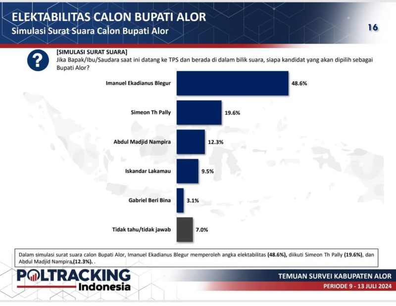 Dalam simulasi semi terbuka calon Bupati Alor, Imanuel Ekadianus Blegur memperoleh angka elektabilitas 40,2 persen, diikuti Simeon Th Pally 14,8 persen, dan Abdul Madjid Nampira 9,2 persen.