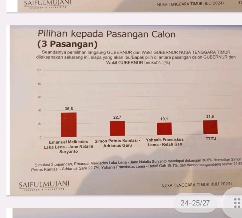 Sebelumnya, Lembaga survei Saiful Mujani Research dan Consulting (SMRC) telah merilis hasil survey Pilkada NTT 2024. Survey SMRC dilakukan pada Tanggal 12-19 Juli 2024. Pada survey SMRC menunjukkan fakta yang mencengangkan. Pasangan Calon Simon Petrus Kamlasi-Andrianus Garu menunjukkan hasil yang signifikan.