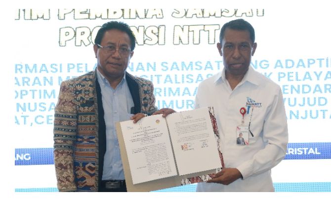 KUPANG,nttpedia.id- Pemerintah Provinsi Nusa Tenggara Timur (NTT) bersama PT Bank Pembangunan Daerah NTT (Bank NTT) resmi menandatangani perjanjian kerja sama mengenai penerimaan pembayaran pajak dan retribusi daerah melalui kanal transaksi Bank NTT. Kerja sama ini menjadi bagian dari upaya percepatan digitalisasi sistem perpajakan daerah yang lebih modern, efisien, dan transparan. Penandatanganan kerja sama dilakukan dalam rangkaian kegiatan Rapat Koordinasi (Rakor) Tim Pembina Samsat Provinsi NTT, yang dibuka secara resmi oleh Wakil Gubernur NTT, Johni Asadoma, di Hotel Swiss-Belinn Kristal Kupang, Kamis 31 Juli 2025. Rakor dengan tema “Transformasi Pelayanan Samsat yang Adaptif dan Rakor dengan tema “Transformasi Pelayanan Samsat yang Adaptif dan Transparan melalui Digitalisasi” ini juga sekaligus peluncuran Aplikasi PRO (Pajak dan Retribusi Online) NTT oleh Wagub NTT Johni Asadoma. BACA JUGA: Mak Ganjar Hadirkan Ide Bisnis Melalui Pelatihan Cara Buat Kacang Ijo Aplikasi PRO diharapkan mempermudah masyarakat dalam melakukan pembayaran Pajak Kendaraan Bermotor (PKB), Bea Balik Nama Kendaraan Bermotor (BBNKB), dan Sumbangan Wajib Dana Kecelakaan Lalu Lintas Jalan (SWDKLLJ).