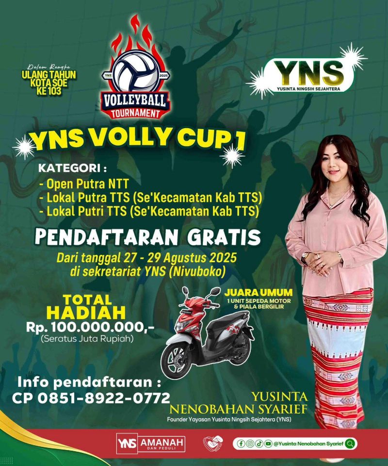 Soe, NTTPedia.id,– Semarak perayaan Hari Ulang Tahun (HUT) Kota Soe ke-103 tahun ini akan terasa semakin meriah dengan hadirnya YNS Volly Cup 1, sebuah turnamen bola voli yang digagas Yayasan Yusinta Ningsih Sejahtera (YNS). Ajang ini resmi dibuka pendaftarannya mulai 27–29 Agustus 2025 di sekretariat YNS yang berlokasi di Nifuboko.