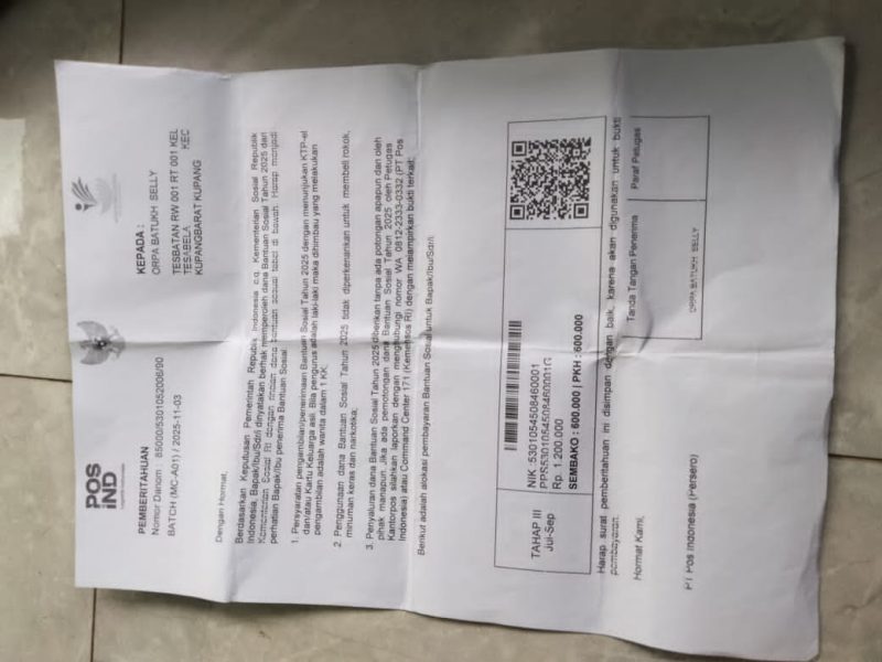 Salah satu warga, Simson Patirick Battukh, mengungkapkan kekecewaannya usai ditolak saat hendak mencairkan bantuan di Kantor Pos Bolok Kupang pada 4 November 2025. Ia datang membawa dokumen lengkap miliknya dan juga milik sang ibu, Orpah Baituni Selly, yang sedang cedera, namun petugas menolak pencairan dengan alasan dana sudah hangus.