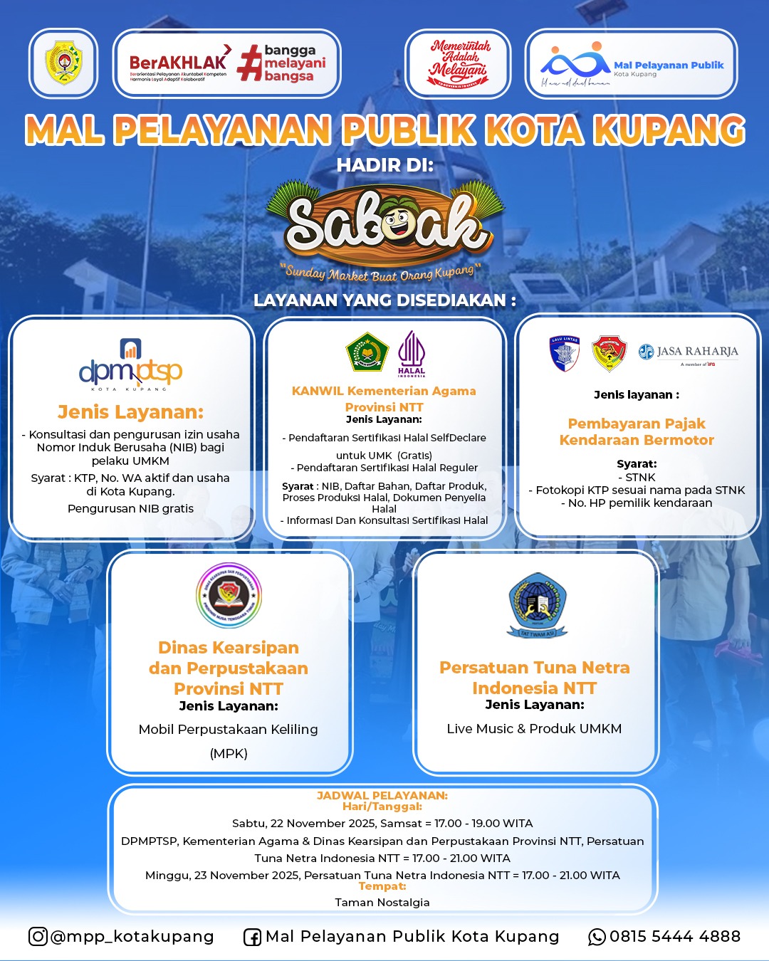 Kepala Dinas Penanaman Modal dan Pelayanan Terpadu Satu Pintu (DPMPTSP) Kota Kupang, Wildrian R. Otta, mengatakan bahwa kehadiran MPP di ruang publik seperti Saboak merupakan upaya untuk menjadikan layanan publik lebih dekat, lebih mudah, dan lebih ramah bagi masyarakat.