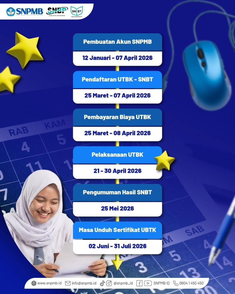 Selanjutnya, pelaksanaan Ujian Tulis Berbasis Komputer (UTBK) dijadwalkan berlangsung pada 21 hingga 30 April 2026. Hasil seleksi kemudian akan diumumkan pada 25 Mei 2026, yang menjadi penentu kelulusan peserta untuk masuk ke Perguruan Tinggi Negeri (PTN) pilihan.
